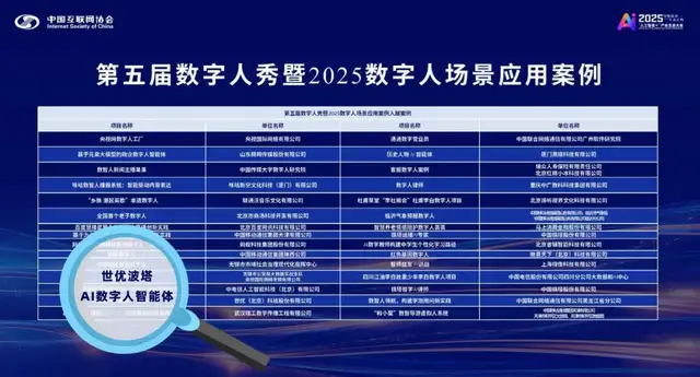 12月1日,由中国互联网协会主办的2025“人工智能+”产业发展论坛在京召开,世优科技作为深耕数字人领域的科技企业受邀出席人工智能与数字人引领终端应用创新论坛,世优波塔AI数字人智能体入选“第五届数字人场景应用典型案例”并编入《中国数字人发展报告(2025)》。